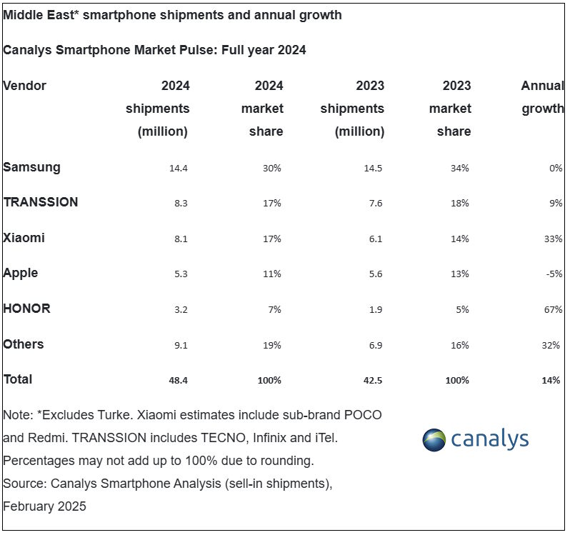 این موفقیت در حالی رقم خورد که بازار گوشیهای هوشمند خاورمیانه (بهجز ترکیه) با رشد 14 درصدی مواجه شد که بهطور قابلتوجهی از میانگین جهانی 7 درصدی فراتر رفت. در مجموع، 48.4 میلیون دستگاه در این منطقه به فروش رسید که رکوردی جدید محسوب میشود.