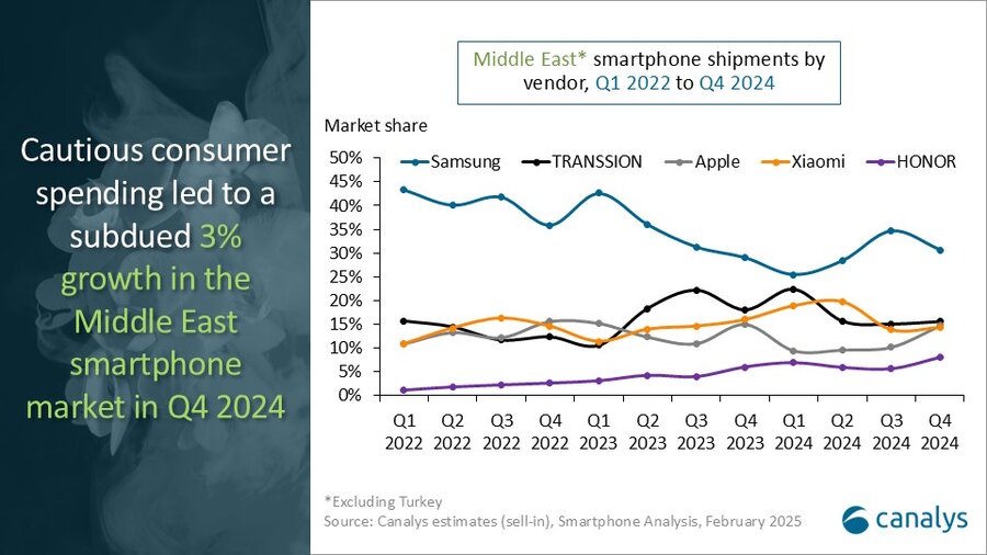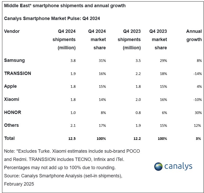 بازار گوشیهای هوشمند خاورمیانه در سال 2024 مقاومت بالایی نشان داد و رشد آن در نیمه اول سال به 29 درصد رسید. با این حال، در سهماهه چهارم، رشد بازار به 3 درصد کاهش یافت و میزان فروش به 12.5 میلیون دستگاه رسید. این کاهش تا حد زیادی منعکسکننده مشکلات مربوط به موجودی انبار و تغییرات اقتصادی بود.