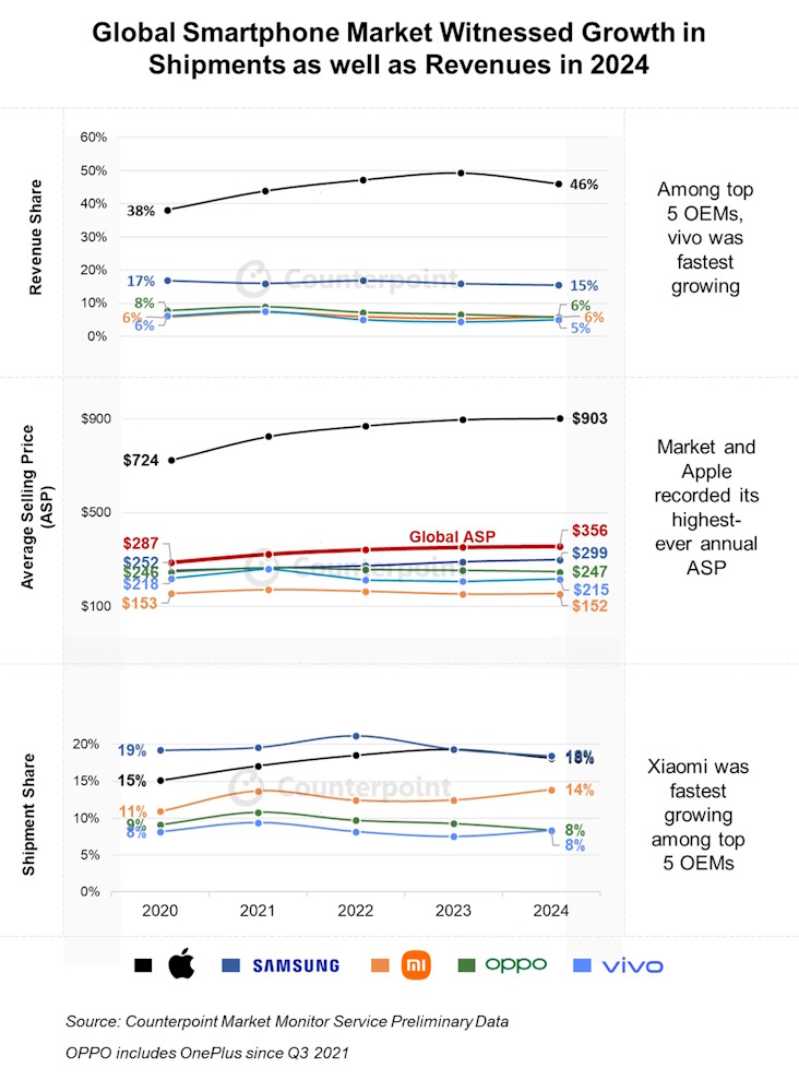 گزارش جدید موسسه Counterpoint Research درباره بازار جهانی گوشیهای هوشمند در سال 2024 نشان میدهد که قیمت میانگین فروش (ASP) گوشیهای سامسونگ 299 دلار بوده است، در حالی که قیمت میانگین سه رقیب اصلی آن یعنی اوپو، ویوو و شیائومی بهترتیب 247، 215 و 152 دلار بوده است.