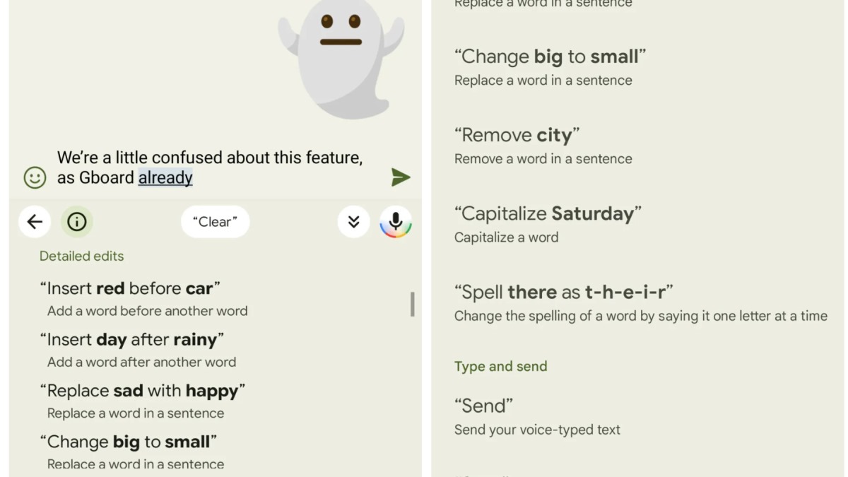 در حال حاضر Gboard از دستورات صوتی ساده برای ویرایش متن پشتیبانی میکند، مانند گفتن کلمه حذف یا ویرایش به همراه بخشی از متن.
